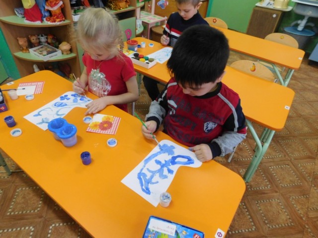 По просьбе «Бабы Яги» дети раскрасили белые валенки росписью «Гжель». А на чёрных валенках выполнили аппликацию из разных материалов (цветные нитки, цветные салфетки, цветная бумага). Дети с большим интересом выполняли все задания и знакомились с новой для них информацией.